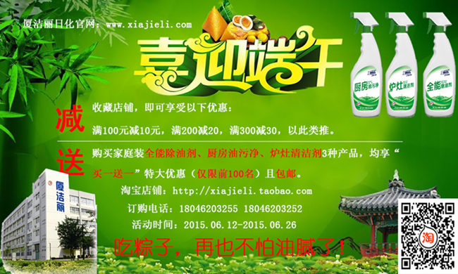 本公司端午大酬宾,推出“买一送一”活动,活动产品有“厨房油污净、全能除油剂、炉灶清洁剂”,而且全场产品满100减10,满200减20,满300减30,以此类推。欢迎新老顾客前来抢购!